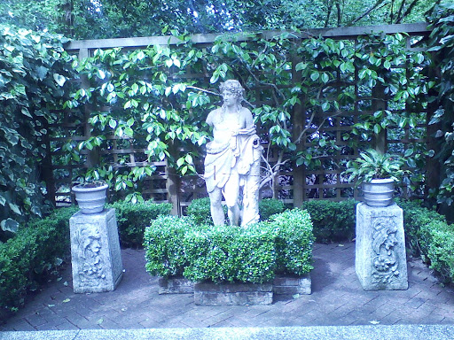 | At the end of this wide walkway is a serene arbor with vines growing down the front of the structure. It is built of beautiful wood and inside sits a statue and a small shade garden with comfortable benches all around the inside walls. (The pool is to the left after the hedge.) |