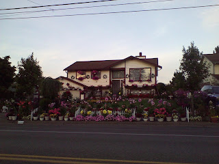 This outrageously opulent garden is in Tacoma, Washington. Even though there is no walking involve (it is private property, after all), I had to share this garden. It made me feel uncomfortable as I drove by this house for years. It seemed like such an embarrassing overindulgence. There are so many plants in pots and so much flowering that I guess I felt overwhelmed just looking at it, too. The gardener has been doing this for at least a decade and I’m starting to really enjoy driving slowly by this house now and then on a beautiful Pacific Northwest summer day. There is a joy and a wild exuberance about this garden that is starting to rub off on me. Although I don’t believe that I’m inspired to do this myself, I am content to be an enthralled observer and I believe this gardener truly enjoys sharing with us all.