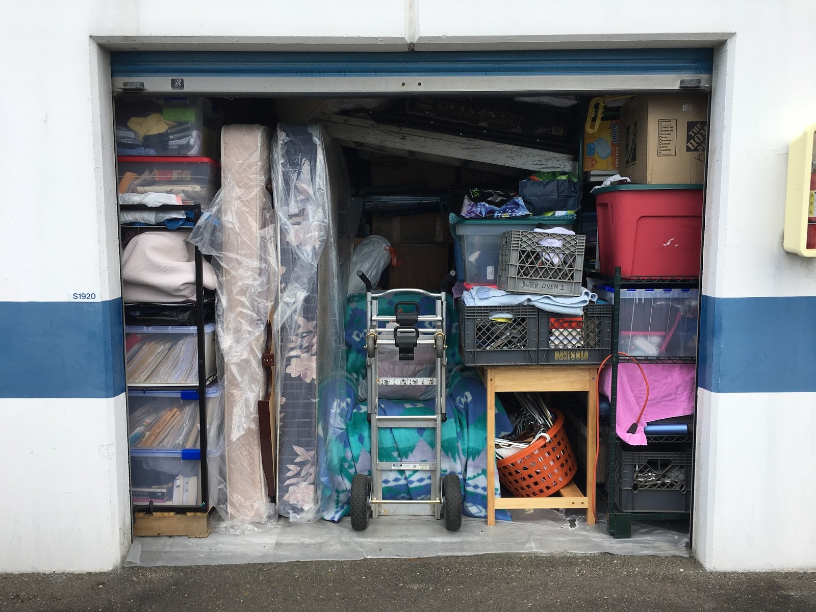 Here is a pic of the final visit to the storage unit to drop off what we don’t need and pick up what we did need before leaving. We actually got everything else in the car, believe it or not, including camping gear and two suitcases each. This and the contents of our car are all our worldly possessions (except for most of the art (stored with the kids), the family jewels (stored with Meghan) and the important papers in the safe deposit box). Steve is an incredible packer, exhibit A below.