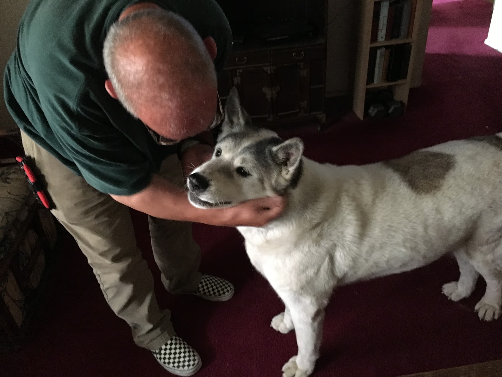 The Akita personality-type, according to Mark, is intelligent, but not prone to separation anxiety, and is very comfortable with being alone. Mark worked a full-time job until recently and Yogi came and went through the dog-door during the day. They got a nice long walk when Mark got home; now it’s at 5am. He seems to be a very happy dog and he adores Mark.