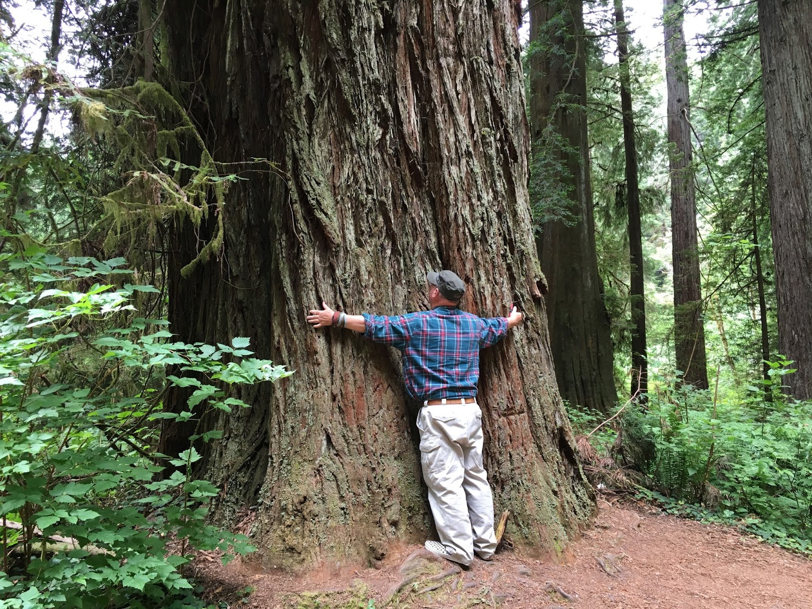 We just drove through the Giant Redwood Forest in Northern California. It’s indescribable, of course, but I’ll try. Photos seem an impossibility right now, not that I didn’t take quite a few. Eventually, these photos of the Redwoods start looking the same, like the views of the beach. I have a few photos that include Steve or myself, just to give a perspective. But, many have seen photos of the Redwoods. Being there is so much different. What struck me was how MANY there are of the giant trees and the realization of how very old they are. These trees can be up to 2000 years old, according to the U.S. National Parks. How does a person wrap their mind around that idea? Some of the trees I saw today could have existed during the Roman Empire, when there were still pharaohs in Egypt, during the Dark Age of Europe and the Renaissance. Some will still be here when I and my children’s children’s children are long dead. They are up to 375 feet tall, wider than the average human is tall, so silent, and so many.