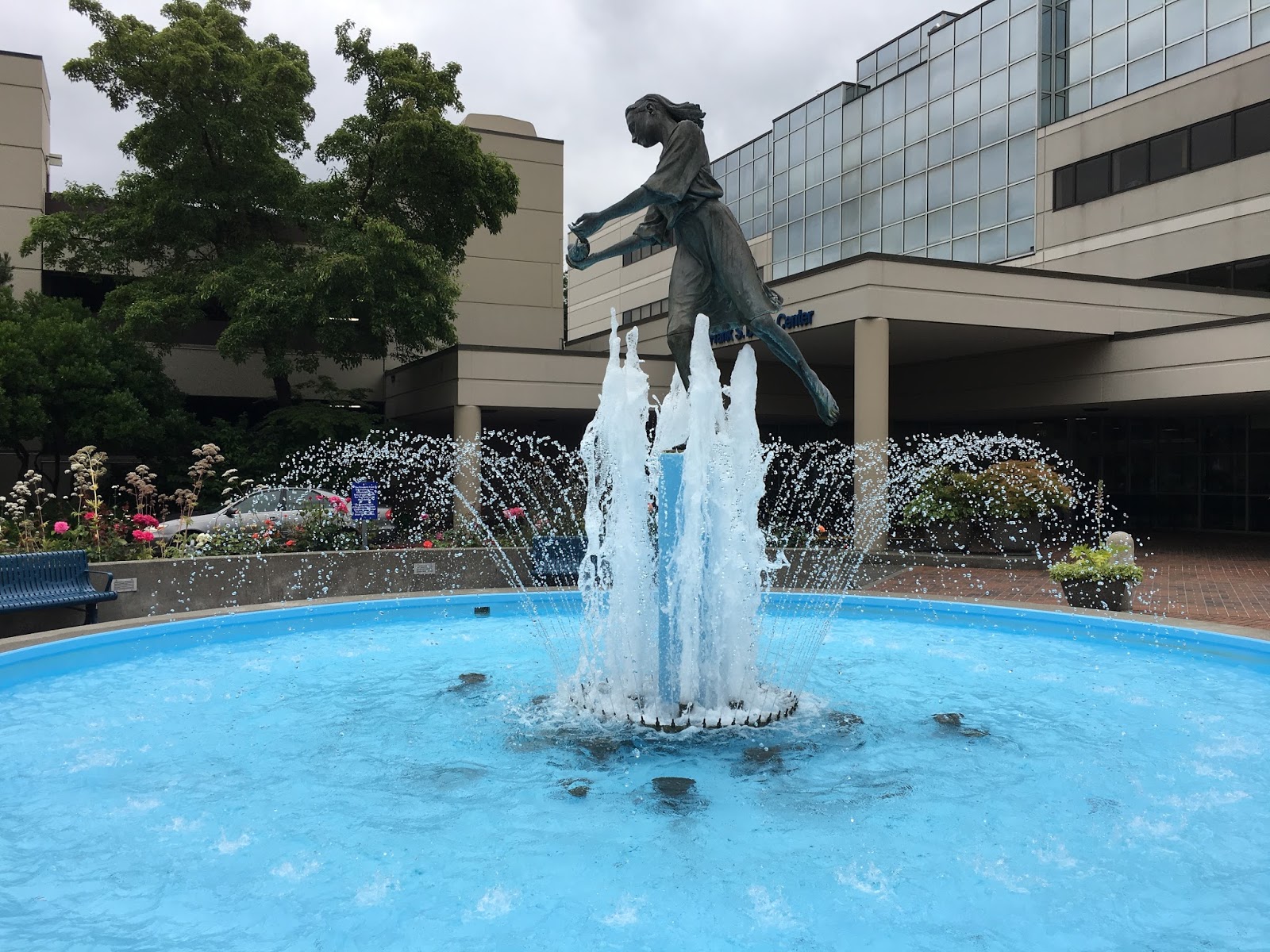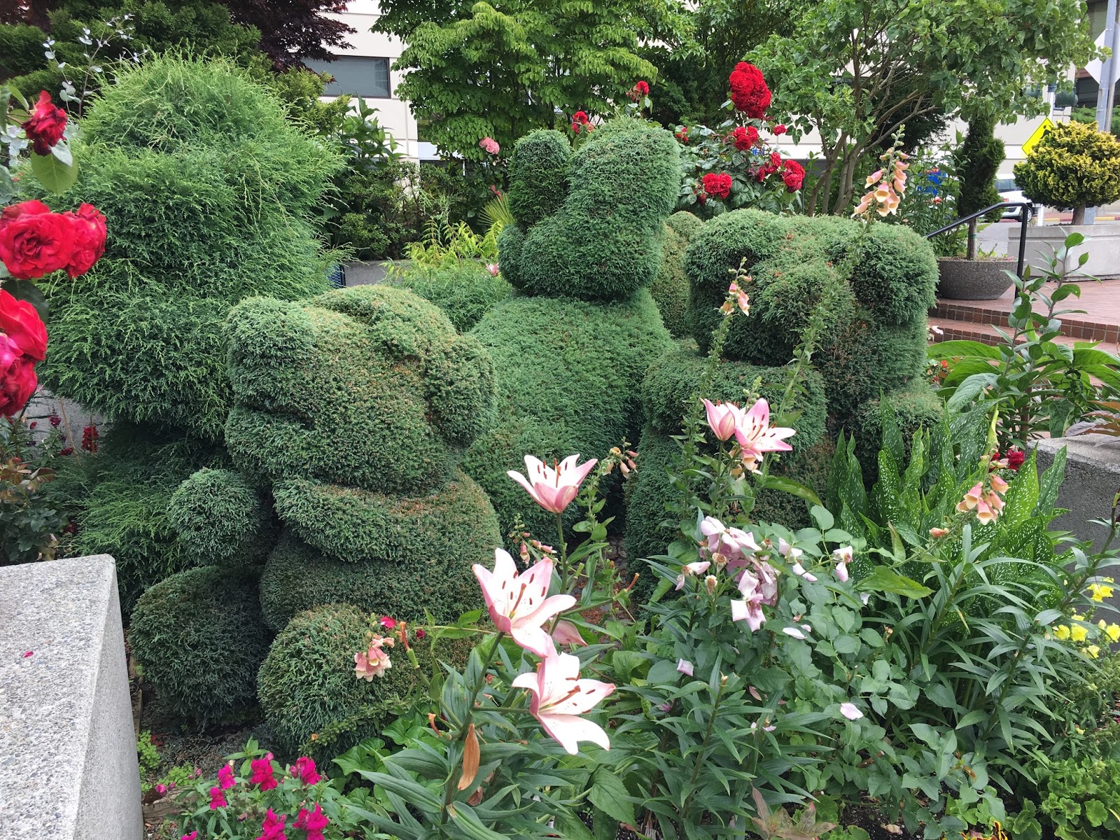 Today, we took care of business: the bank, the School District, the phone company, the mail, and Steve turned in his Volunteer badge at Multicare Tacoma General Hospital. He’s worked as an official volunteer there, among other things trimming the roses in the Mary Bridge Children’s Hospital rose gardens. It has been a commitment that he has enjoyed for many years. While he turned in his “shears”, I walked among the gardens that he so carefully tended and took some photos to share. The care that the Multicare groundskeeping crew puts into making these gardens a quiet place to sit for hurting little patients, friends and relatives is inspiring. I mean, look at these gardens. The topiary are so easily recognized as playful animals and the roses have such heavenly scents. There is a fountain, with the musical sounds of water dancing, and a statue of a child dancing right in the middle of the pool. Steve kept these roses fresh and beautiful and I’m sure they have comforted thousands of people at a time when they needed it most. He and the rest of the groundskeepers really make a difference in people’s lives.