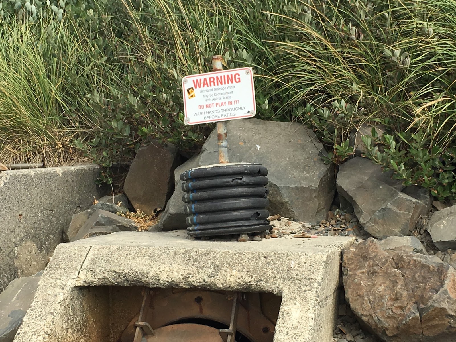 | This sign over the opening of a rusty pipe at the entrance to the beach says, “Warning: untreated drainage water may be contaminated with animal waste. Do not play int it! Wash hands throughly before eating.” |