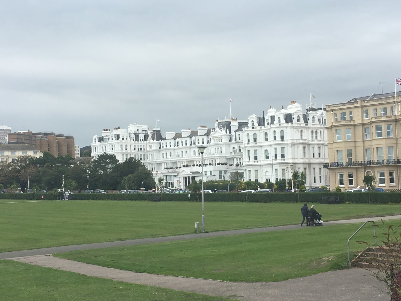 | The Grand Hotel, built in 1875, is known as The White Palace and is the only 5 star hotel on the English coast. Our host says it looks like a wedding cake and I agree. |
