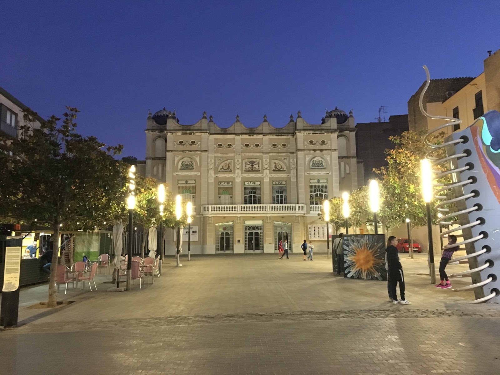 In Figueres, the home of Salvador Dali and the Dali Theatre and Museum, we have a room in someone’s apartment through AirBnb, not the whole apartment this time. It is a gorgeous modern apartment and we have a huge bed in a beautifully appointed room with adjacent bathroom. Our room has a tiny balcony overlooking a side-street and the apartment itself has a beautiful terrace balcony overlooking the small plaza beside the apartment building, with a great view of the Teatro Jardi Cine which apparently has frequent concerts and lots of activity periodically. Tonight, it was at rest.