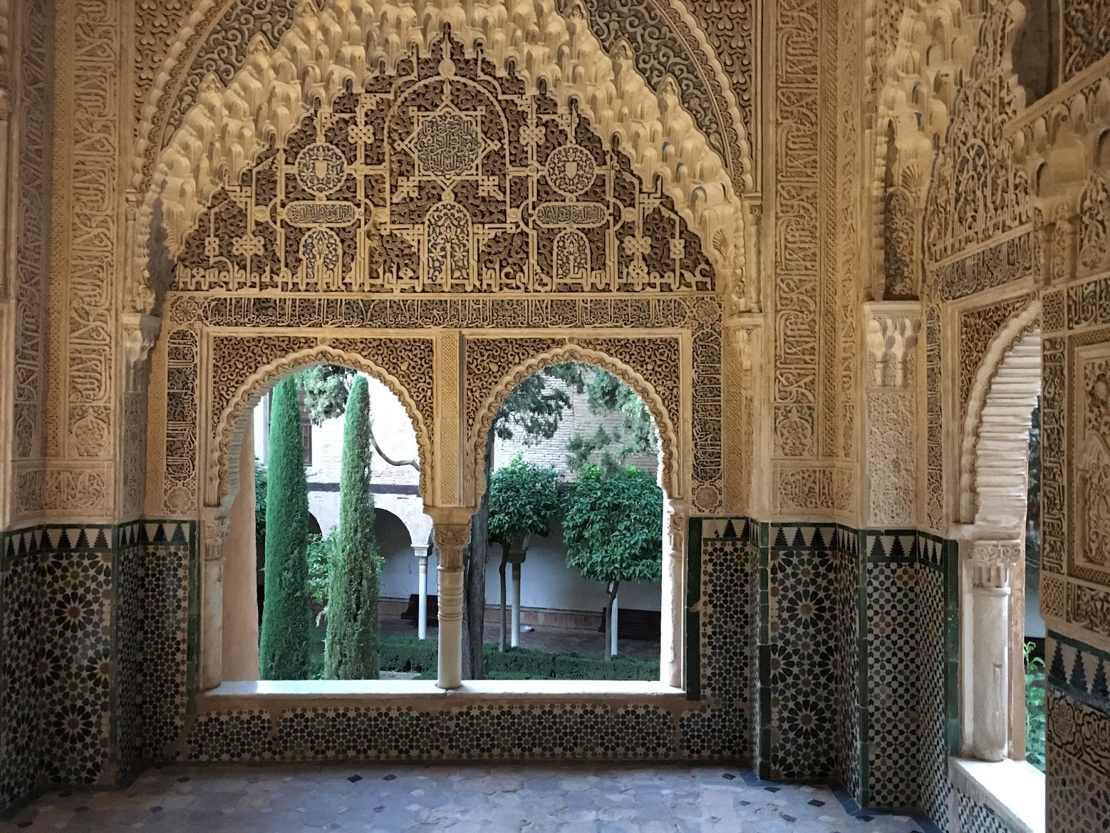 Our guide, Jose, took the opportunity to explain the connections to Islam of many of the decorations and architectural features. The square is important the Islamic faith and the numbers 7 and 8. The intricate decorations are literally writing of the name Allah in two different scripts and the few symbols that Islam allows – natural things like trees, plants, and stars (especially the 8 pointed star).