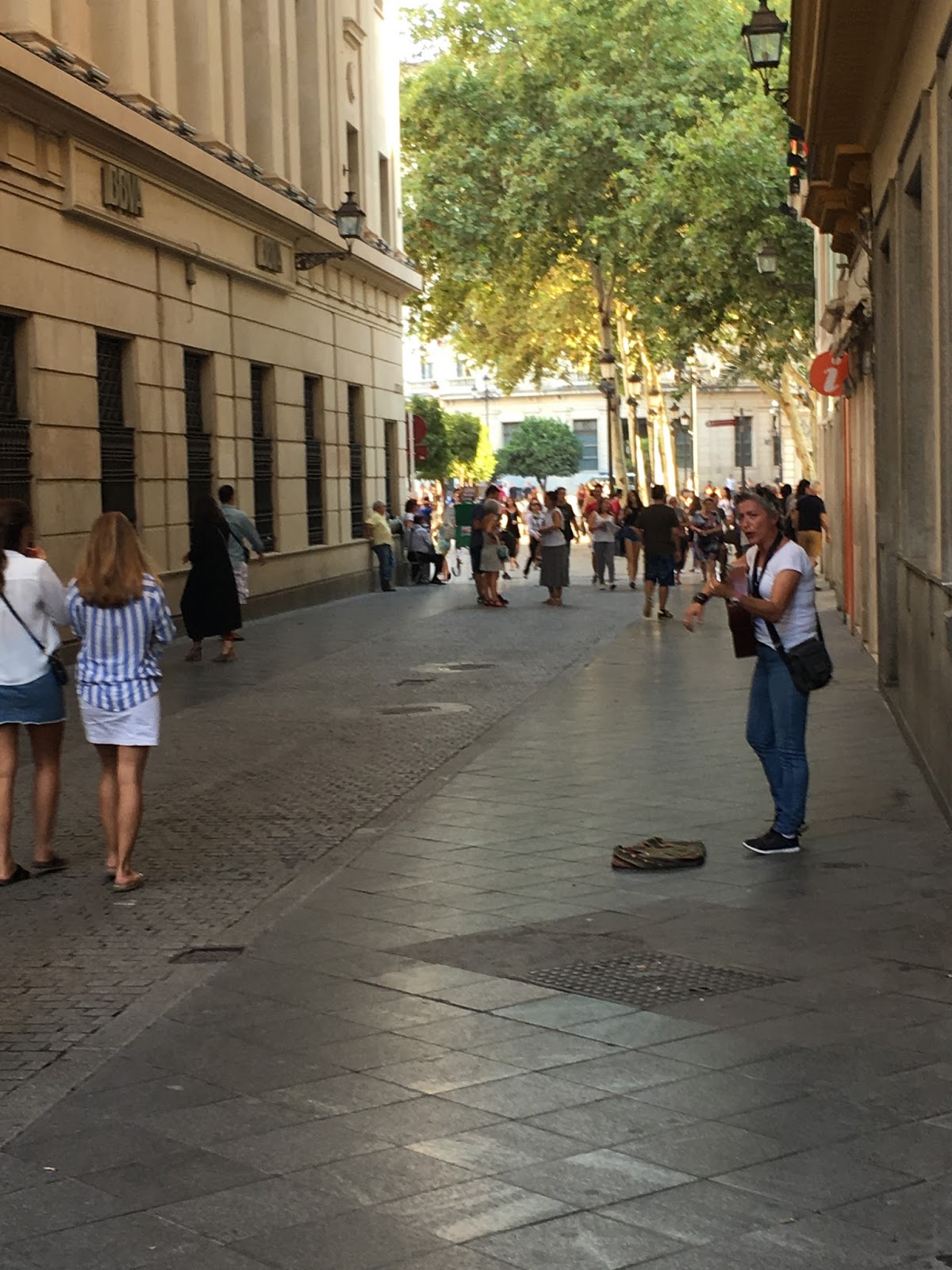 Our one night trip was obviously no where near enough time. We just wanted to see it on our way through to the south of Spain. It was beautiful and exciting in the late afternoon and evening. We ate, shopped for shoes for Donnie’s poor little toe, and wandered the streets with just about every living soul in Seville. There was some kind of event happening in the Plaza de Espana, but we didn’t get close enough to tell what it was. This is pretty much what I experienced in the Plaza Mayor in Madrid. Thousands out walking (the Paseo) and gathering in the city’s central Plaza (pronounced platha myore).